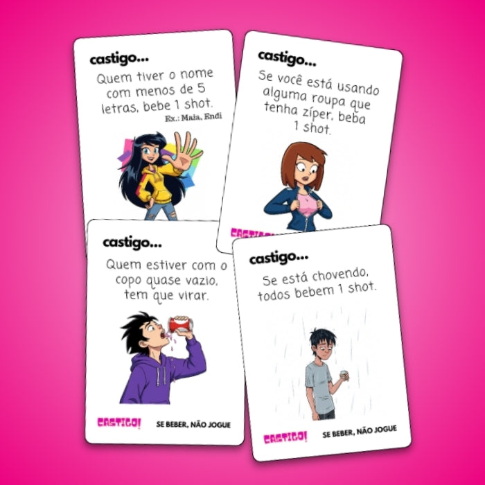 Cada carta traz uma situação específica — e se você se encaixar, bebe um shot na hora.