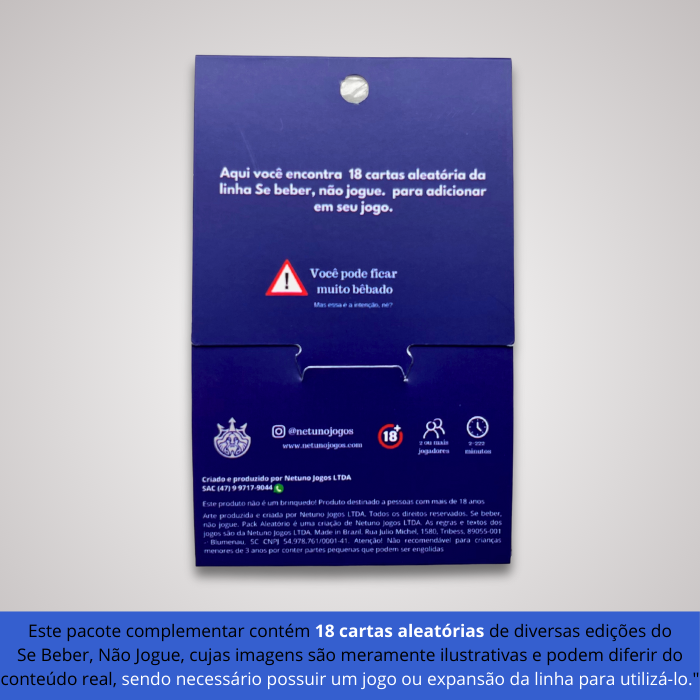 Este pacote contém 18 cartas aleatórias, que podem vir de qualquer versão ou expansão do universo Se Beber, Não Jogue.