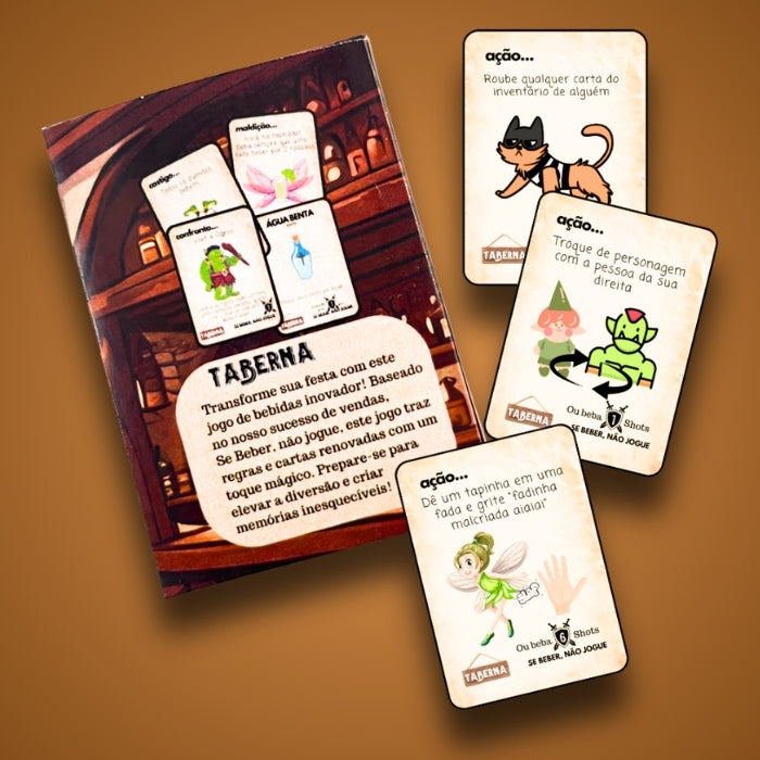 Prepare-se para uma aventura épica com Taberna, a versão medieval do clássico Se Beber, Não Jogue™! Embarque em uma jornada fantástica onde você pode encarnar personagens icônicos como Fadas, Ogros, Duendes ou Anões. Quem determinará sua identidade são as cartas mágicas!